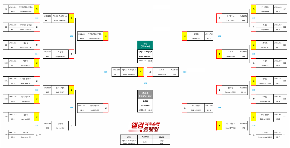 결승에서 마르티네스에게 패배한 '슈퍼맨' 조재호는 지난 시즌 8차투어인 웰컴저축은행 챔피언십 준우승에 이어 4개 대회 만에 통산 6승에 도전했으나 결국 다음 대회로 미뤄야 했다.